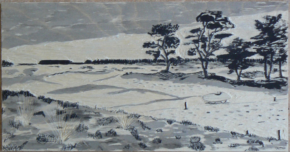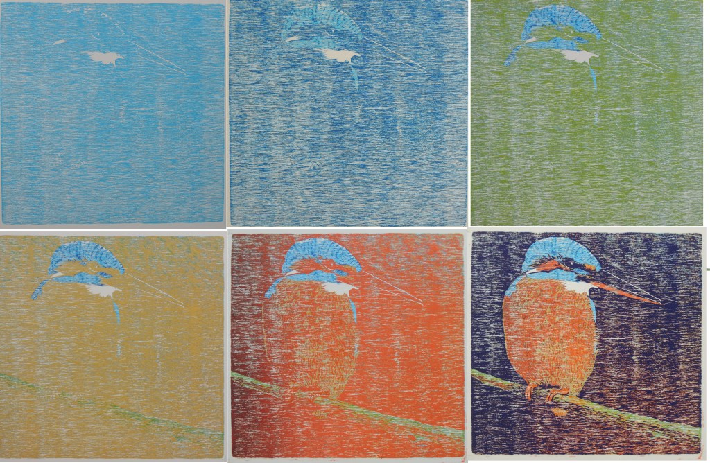 Het is ook mogelijk om dezelfde afbeelding in verschillende kleuren te maken. Zie bijvoorbeeld de ‘Aalscholver op molenwiek’ onder het kopje houtsneden.